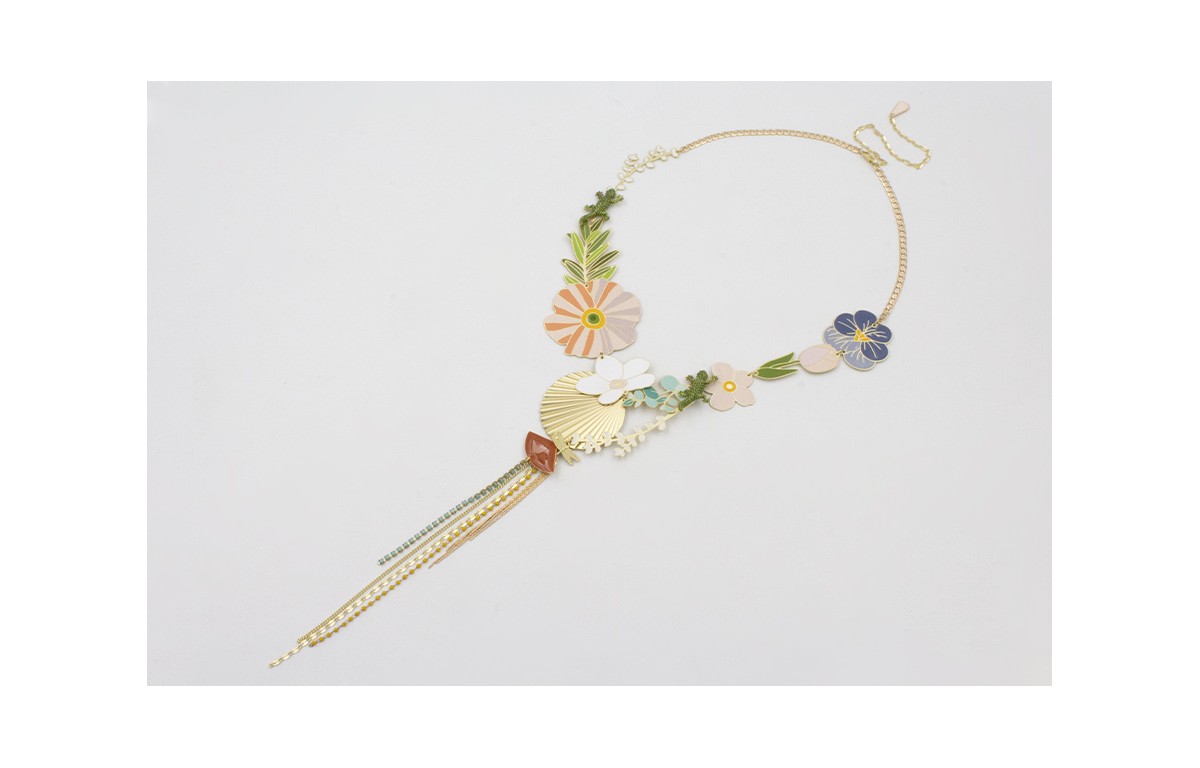 Collar cadena eslabón plano con piezas esmaltados, margarita, flor rosa, flor azul, ramas verde,azul,blanca, tulipan rosa, disco ondulado con flecos cadena strass turquesa y dorado mate.
