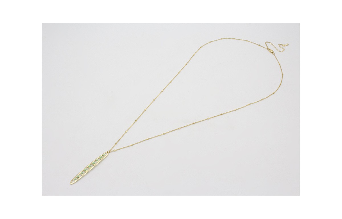 Collar cadena micro bola dorada mate con colgante vaina de guisantes esmaltada turquesa. Largo 64cm.