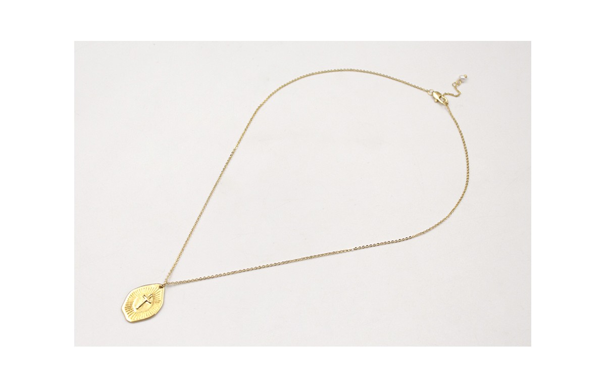 Collar ORO18k-3 micras cadena eslabón pequeño con colgante irregular cruz rematado con perla natural. Largo 35cm.