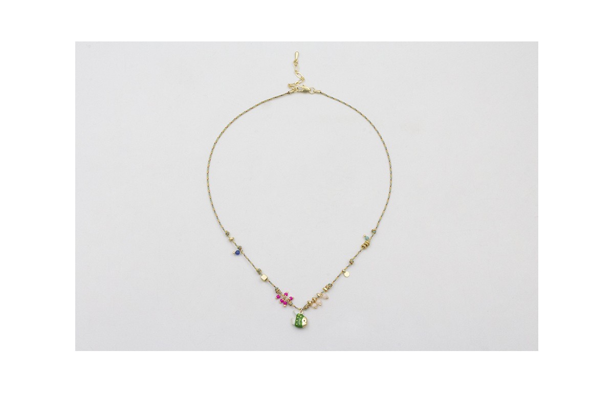 Collar hilo micro driza azul,amarillo,rojo y dorado con nudos, cubo dorado mate, pez esmaltado azul y verde, cuentas colgando fucsias,beiges,azules rematado con cadena reguladora.
