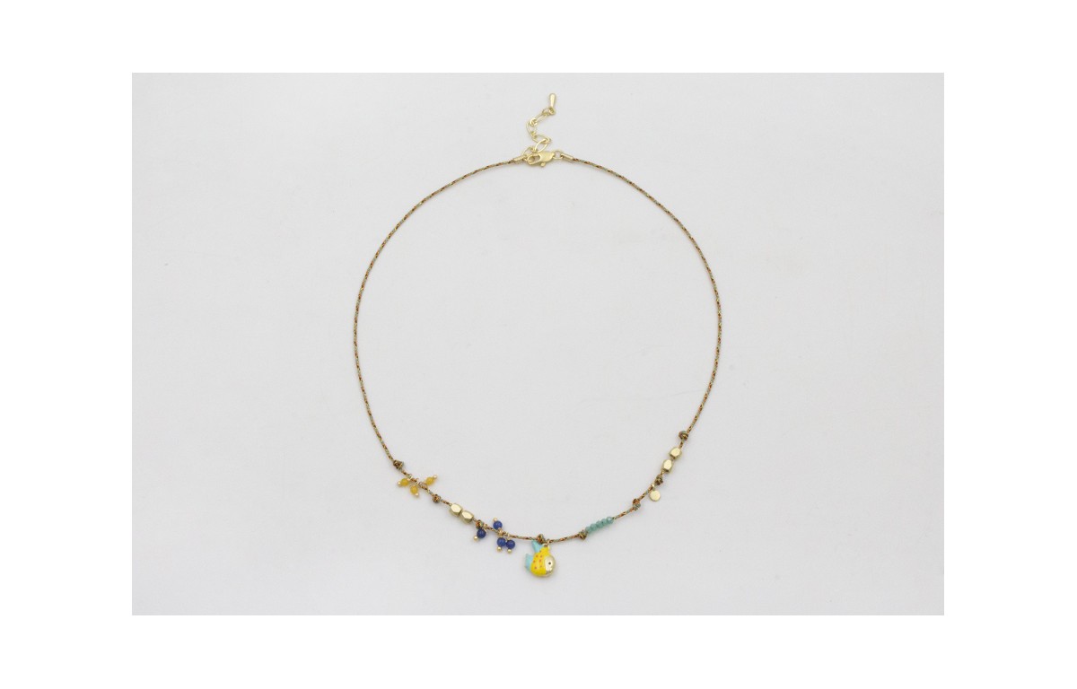 Collar hilo micro driza rosa,azul y dorado con nudos, facetadas doradas mates, pez esmaltado turquesa y amarillo, cuentas colgando azules,amarillas rematado con cadena reguladora.