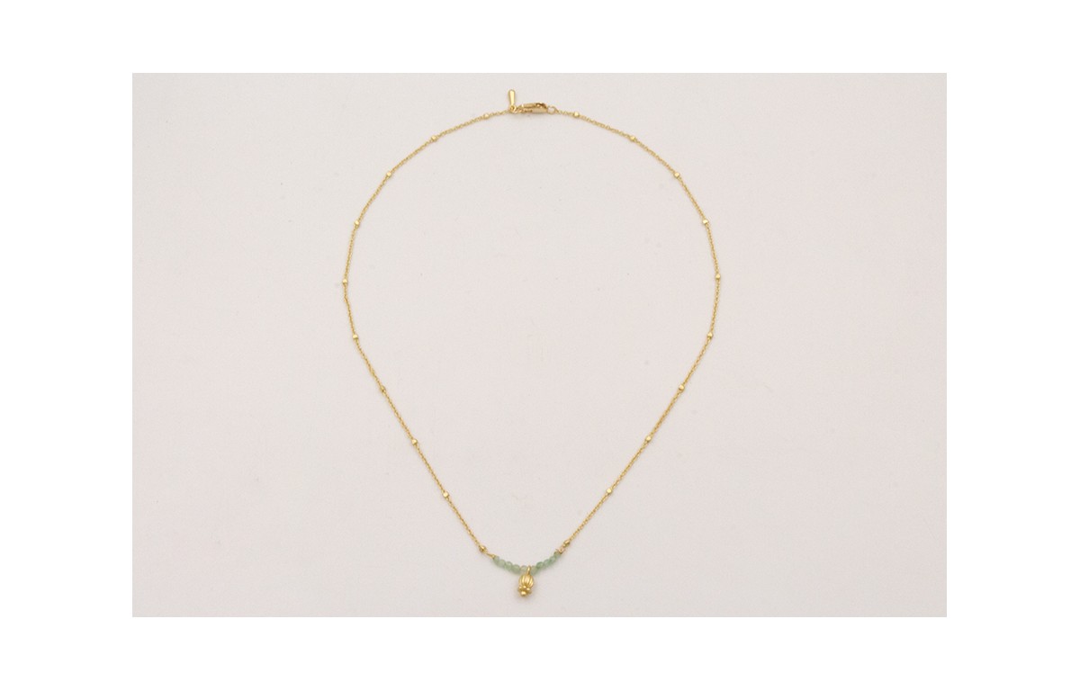 Collar cadena eslabón y micro bola dorada mate con colgante campanilla y semipreciosas cuarzo verde.