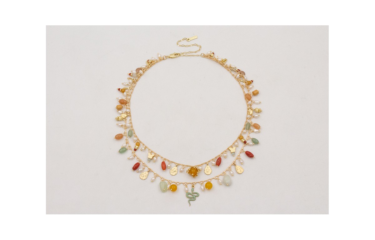 Collar doble de cadena medio eslabón dorado mate con colgantes perlas, esmalte visón, lámina labrada, serpiente esmaltada turquesa, mariposas