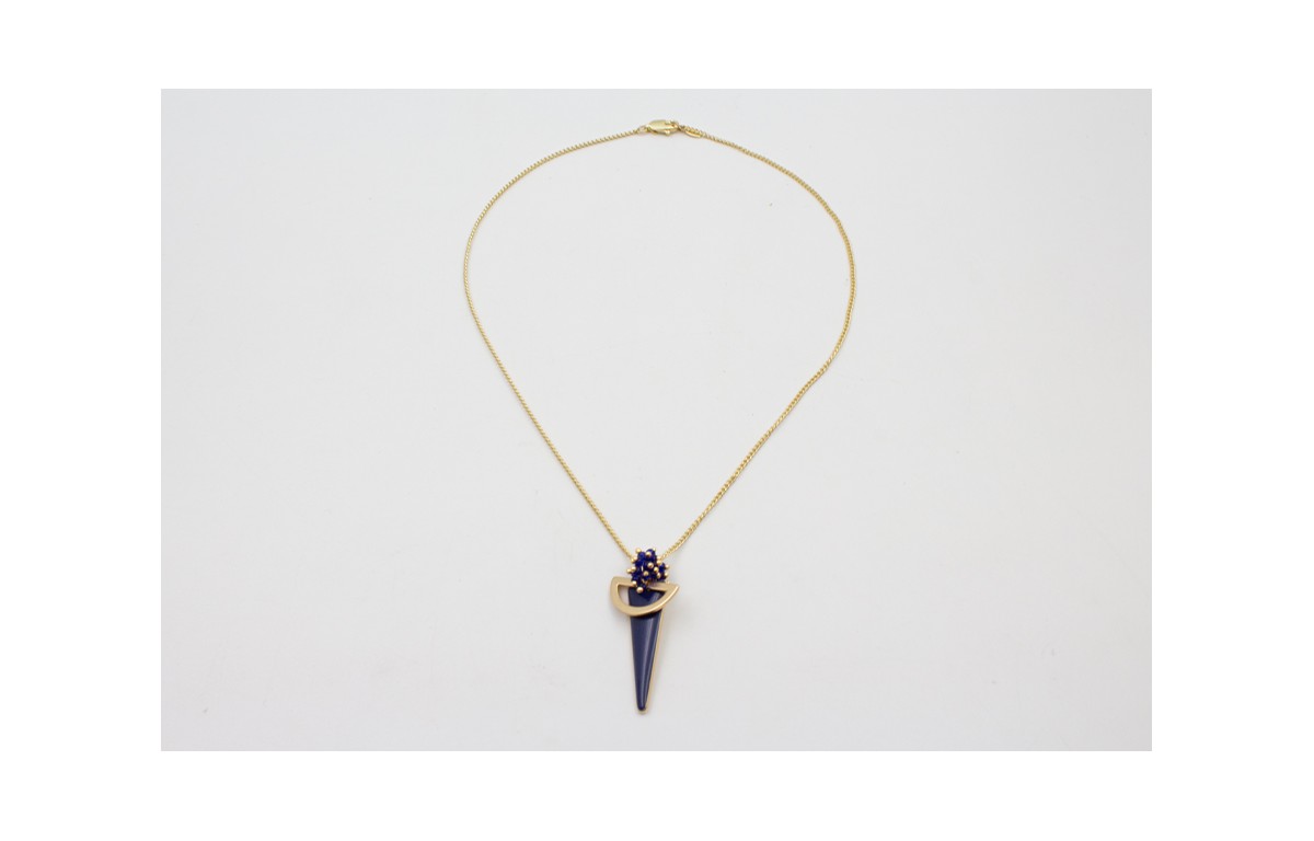 Collar cadena eslabón plano dorado mate con burruño de abalorio azulón y triangulo esmaltado azul oscuro.