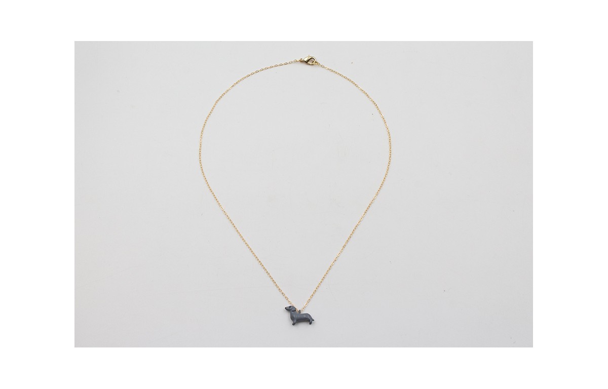 Solitario cadena eslabón pequeño dorado con perro SALCHICHA pintado a mano gris y negro.