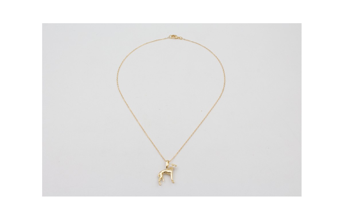 Solitario cadena eslabón pequeño dorado con perro GALGO con collar de perlas.