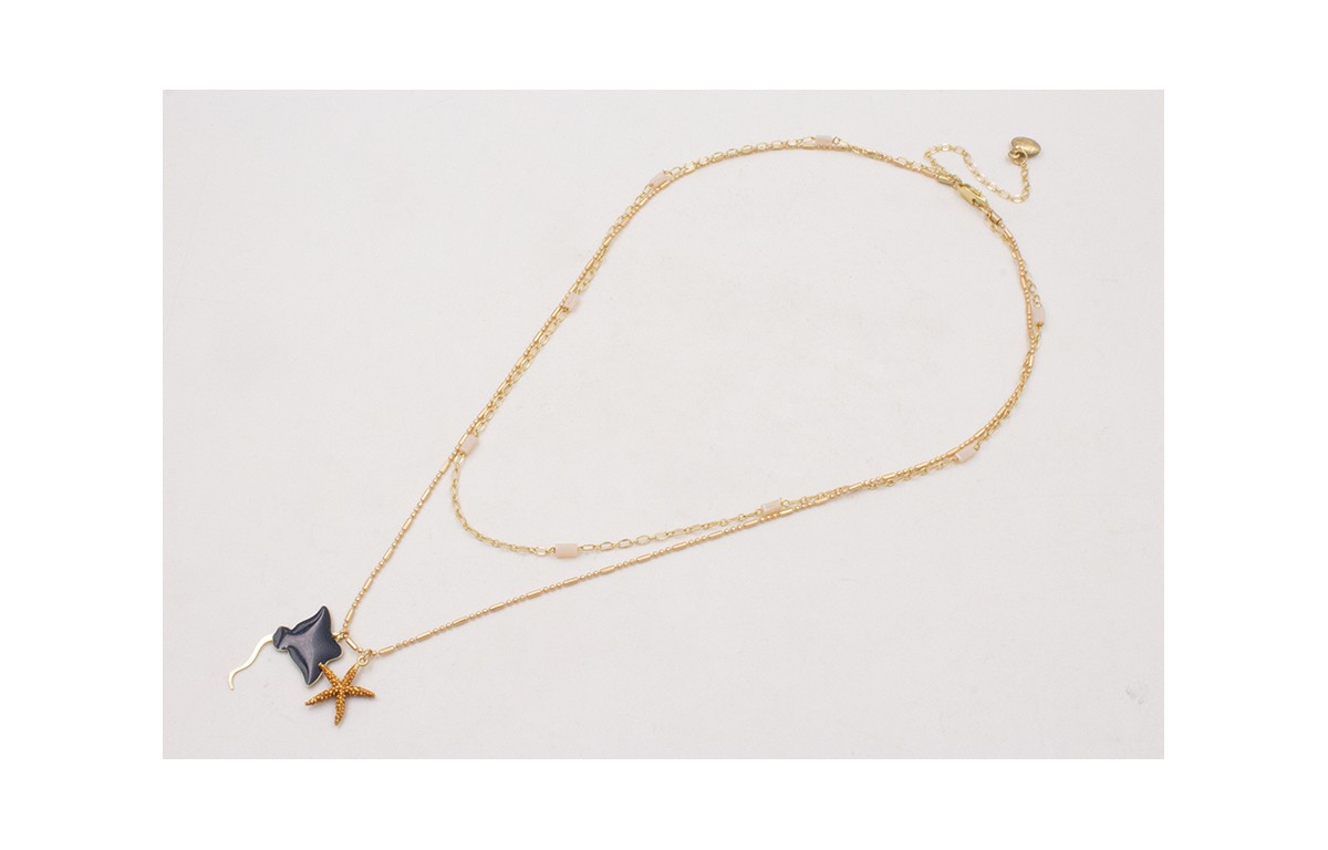 Collar doble con manta raya azul oscuro y estrella de mar marron en el largo y rectangulos beige en el corto