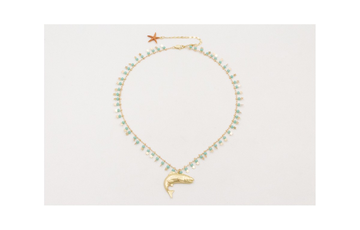 Collar cadena colgante bola turquesa y estrella dorada mate con colgante pez, rematado con estrella esmaltada marrón.