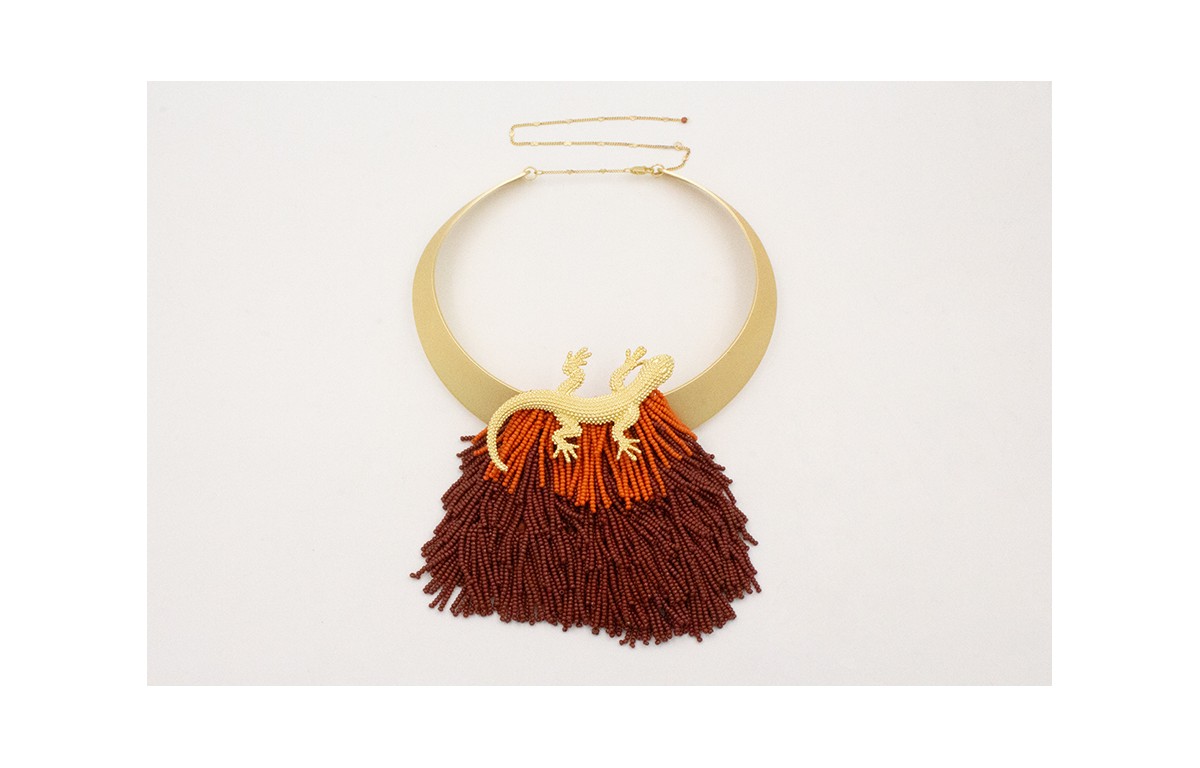 Collar lámina con flecos de abalorio marrones y naranja con lagarto grande dorado mate.