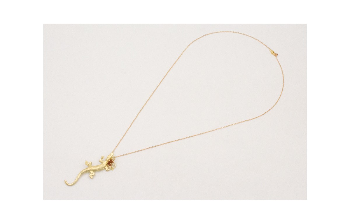 Colitrio cadena micro ovalo dorado mate con colgante lagarto grande con collar cubitos cuarzo marrón efacto brillo.