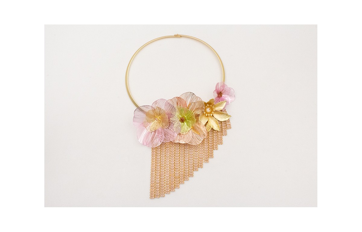 Collar lámina con fleco en disminución de cadena de strass cristales rosas, flores metalicas verdes,rosas,cobre y flor grande dorada mate.