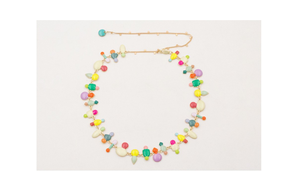 Collar esmaltitos de colores a 2 alturas con cadena chapitas dorada mate, rematada con disco esmaltado turquesa.