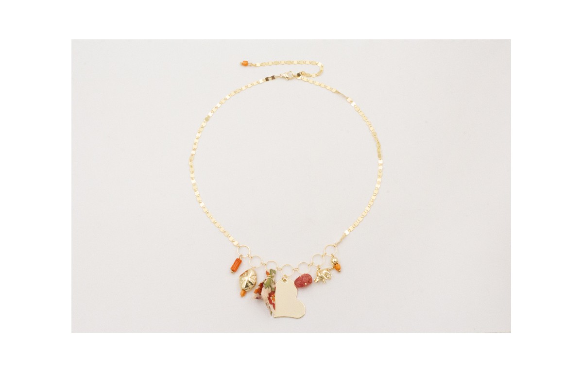 Collar cadena láminas ovaladas con colgantes dorados, corazón,dinosaurio,pepita tranversal inscripciones, lazo bies flores beige y rojas.
