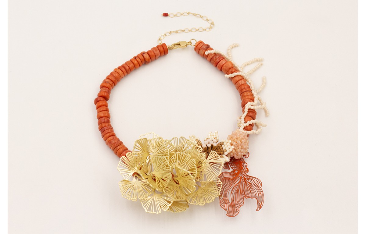 Collar discos coral con calas planas doradas mate, pez tropical naranja,flor miyuki blanco y dorado,bola abalorio arena.