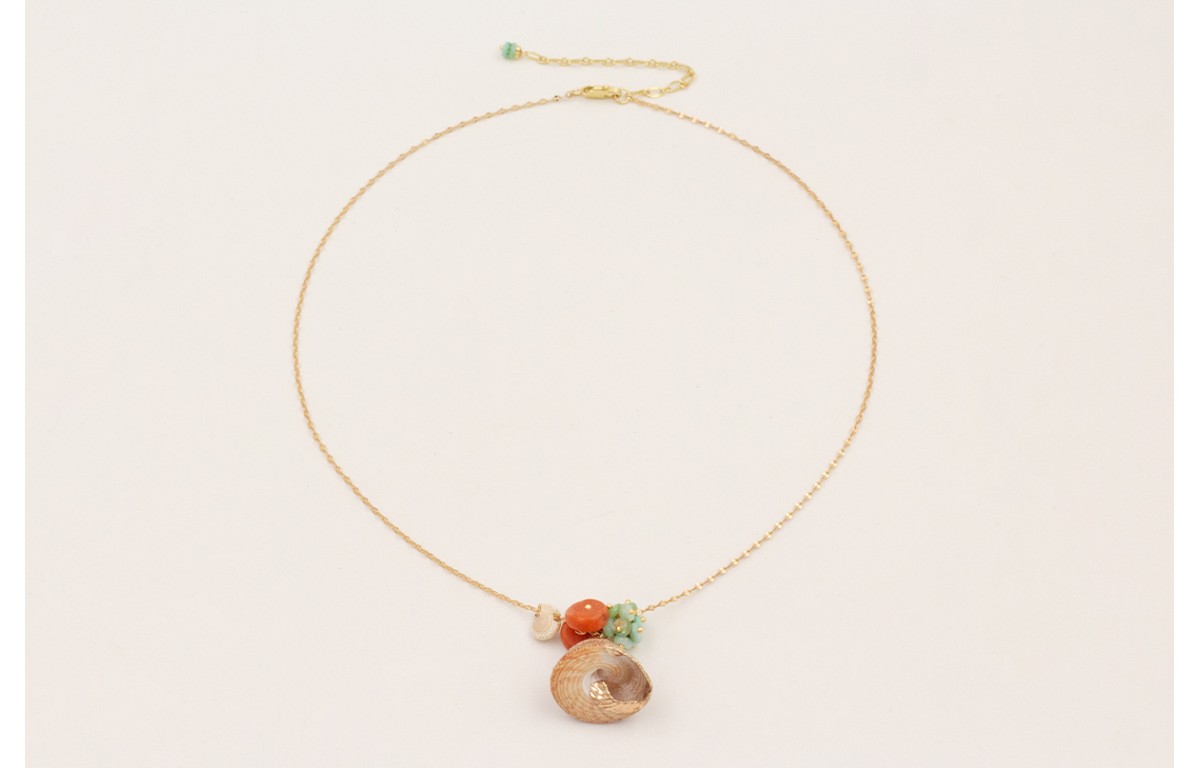 Collar cadena micro ovalo con caracola piramidal bordes dorados, diacos coral, mini caracola y burruño discos coral turquesa.