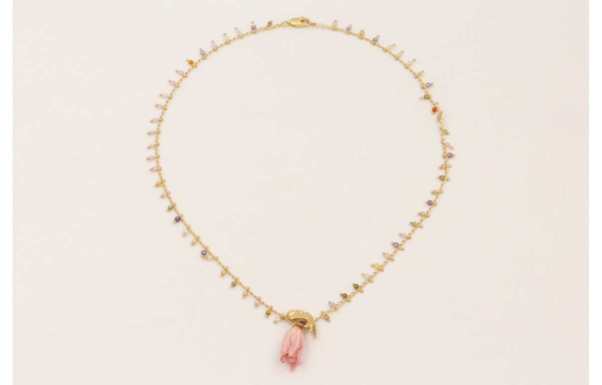 Collar cadena bolitas facetadas multicolor con campanilla flor natural rosa, golondrina dorada mate.
