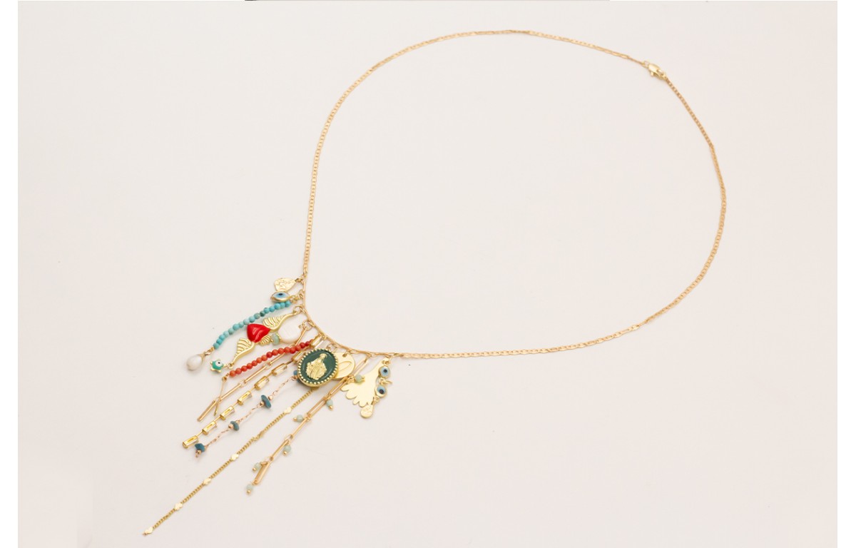 Collar collar cadena eslabón aplastado con colgantes virgen esmalte verde, baston semipreciosas, ojo turco, chapa corazón, varias cadenas.
