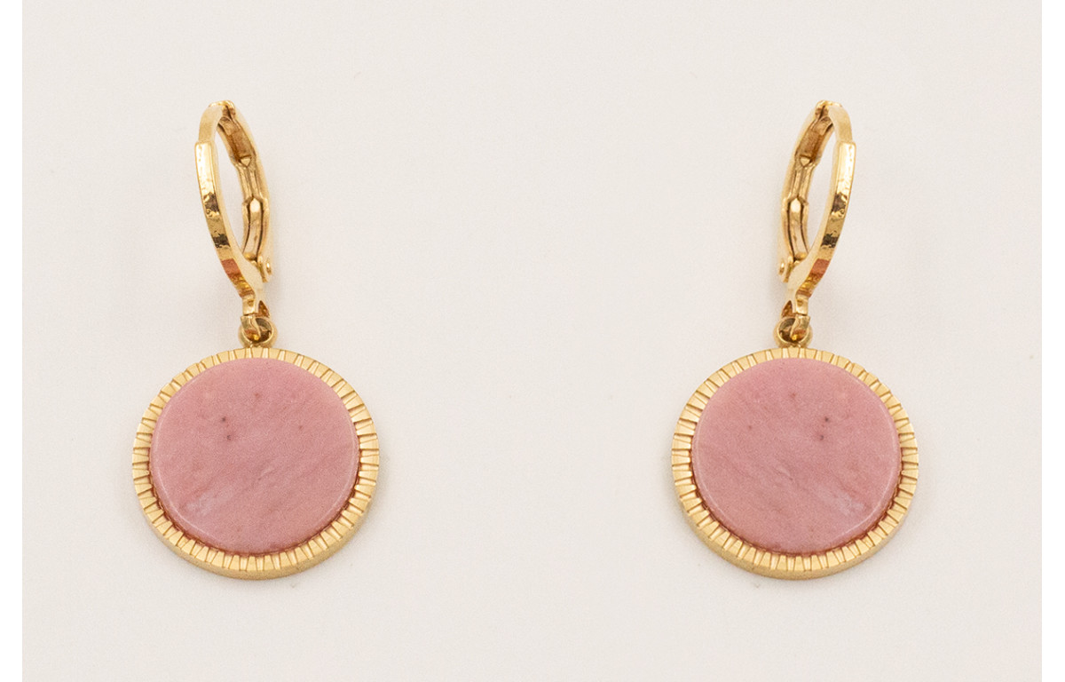 Pendientes cierre aro baño ORO18K-3 micras, colgante disco acero inoxidable piedra rosa.