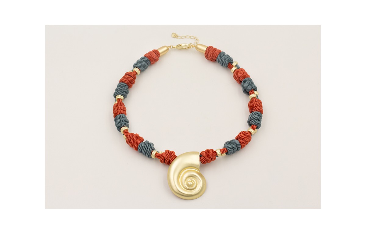 Collar cordón trenzado teja y azul piedra con nudos, entrepiezas y colgante concha en dorado mate.