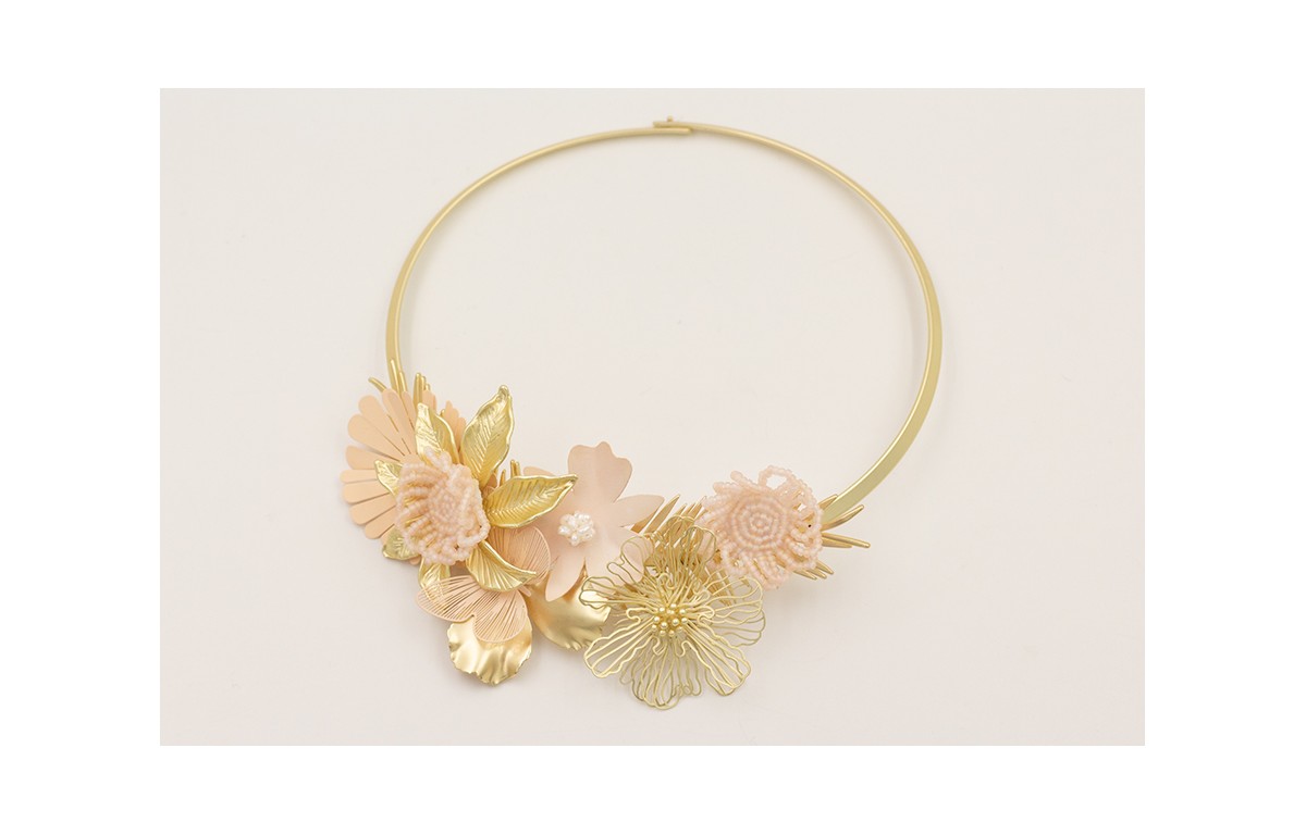 Collar rigido con rama dorada mate con pendientes pétalos rosa palo, flor grande, mariposa rosita,bola perlas y flor abalorio rosa transparante.