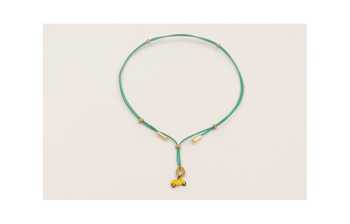 Collar cordón hilo dorado color turquesa,nudos macramé hilo dorado con colgante vespa esmaltada amarilla y terminales largo dorados brillante.