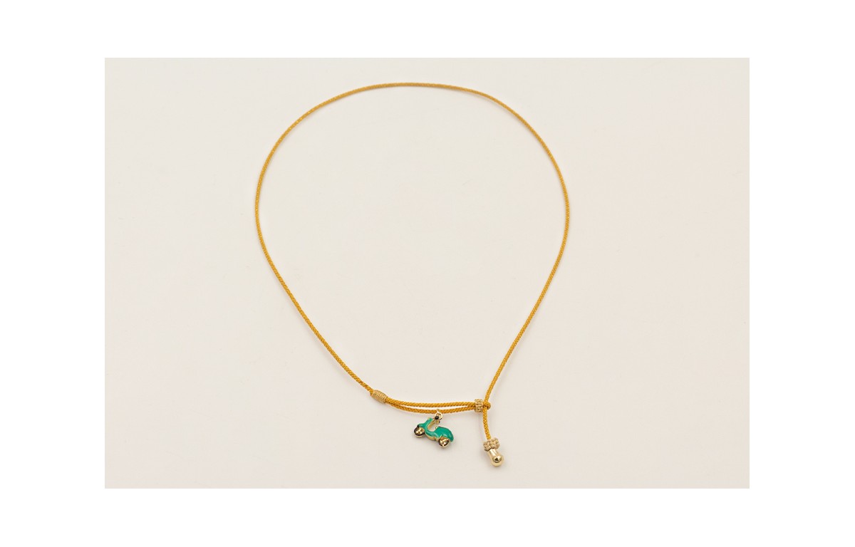 Collar cordón hilo dorado color mostaza,nudos macramé hilo dorado con colgante vespa esmaltada verde y capuchón dorado brillante.