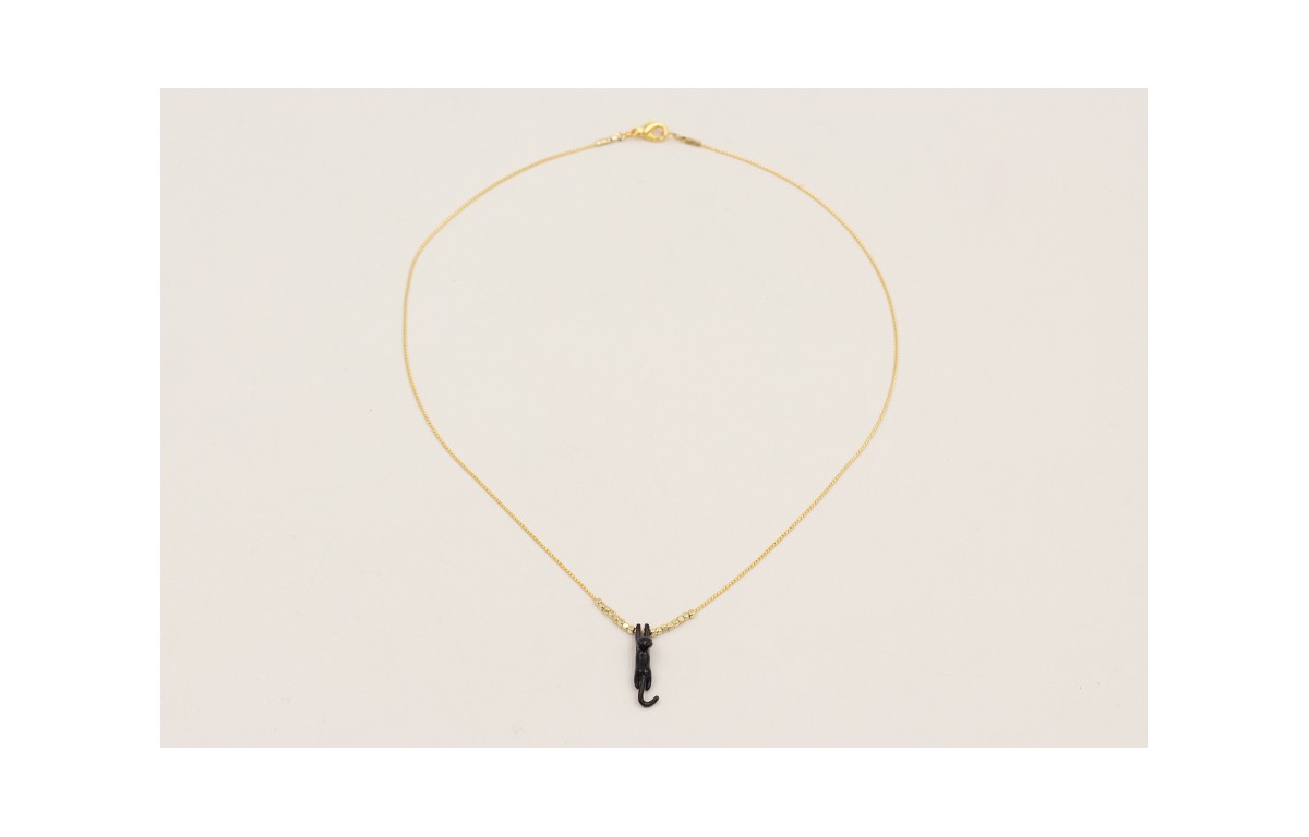 Solitario gato esmalte negro con microcubos dorados y cacdena fina dorada.