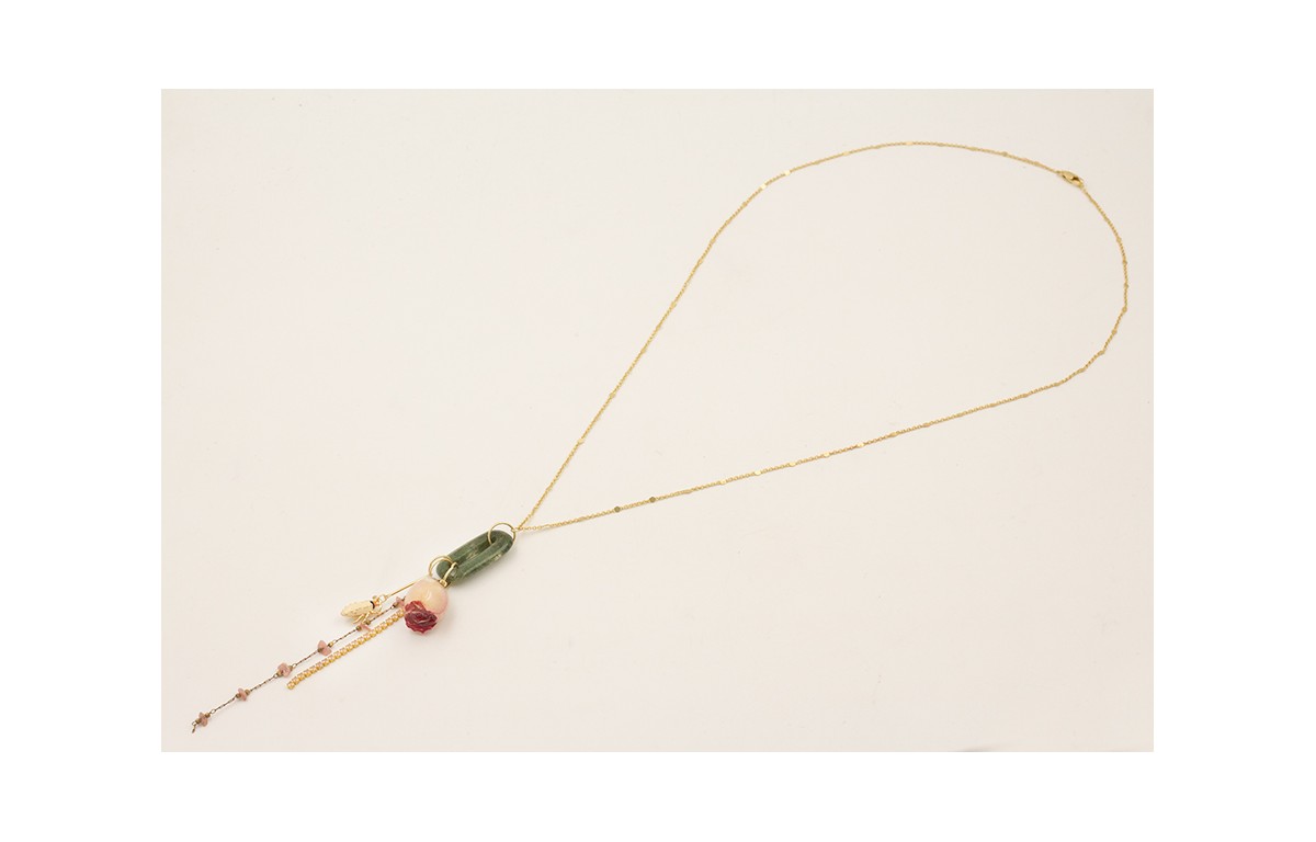 Collar largo cadena chapitas dorada mate con eslabón jade verdoso, rosa natural, escarabajo esmalte beige, fleco cadena strass rosa y cadena chips turmaline rosas