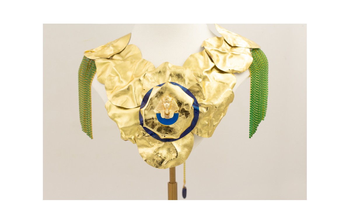 Collar discos de lentejuela dorados con hombreras cadena strass verde, colgante faraón esmaltado azulón.