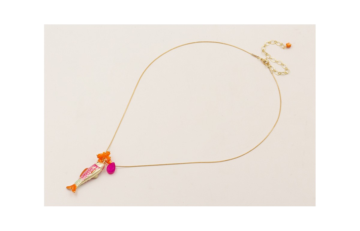 Collar cadena fina dorada con pez esmaltado rosa,naranja,verde, gota fucsia y cubitos nacar naranja.