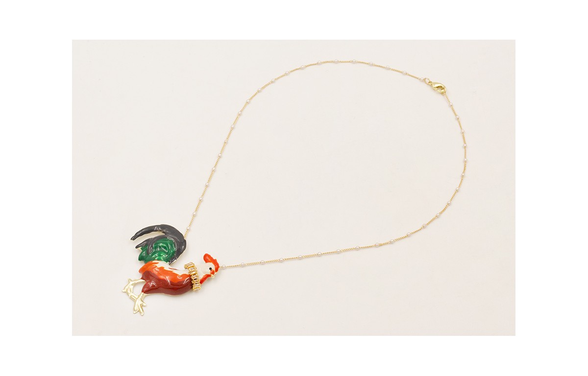 Collar cadena perlitas intercaladas con gallina esmaltada y collar cadena strass rectangular cristal.