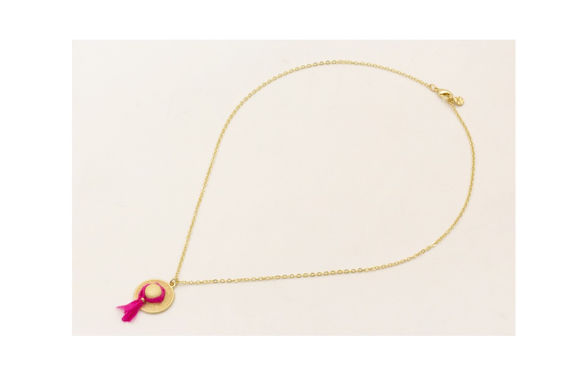 Collar cadena eslabón pequeño dorado mate con colgante sombrero dorado mate con cinta seda fucsia.