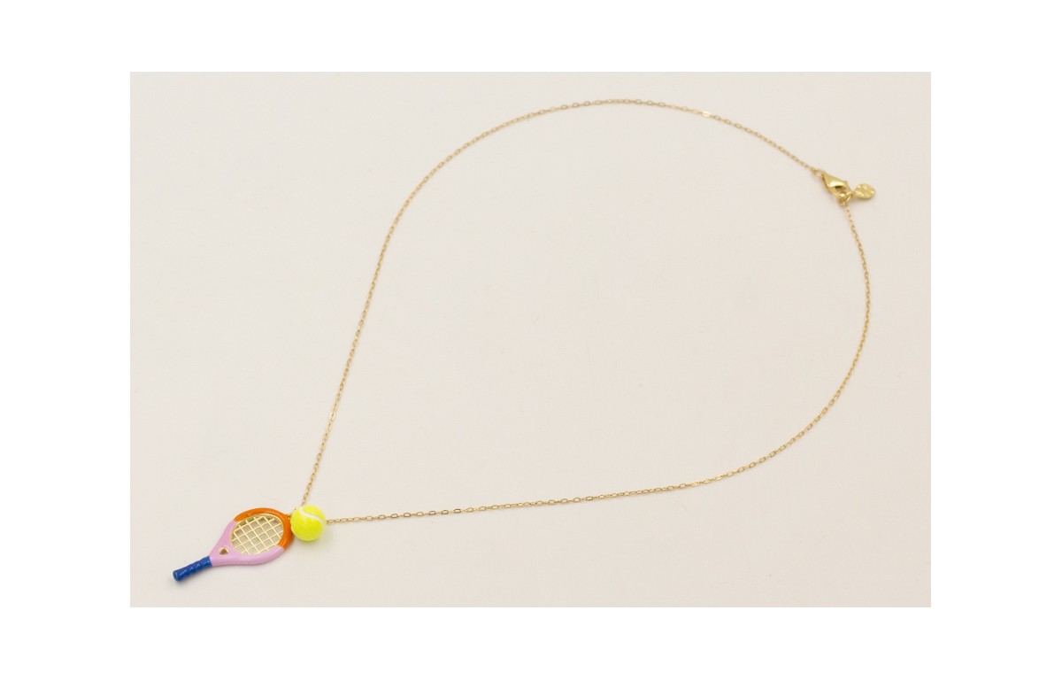 Solitario cadena eslabón pequeño dorado con colgante raqueta esmaltada morado, azul, naranja y pelota de tenis esmaltada.