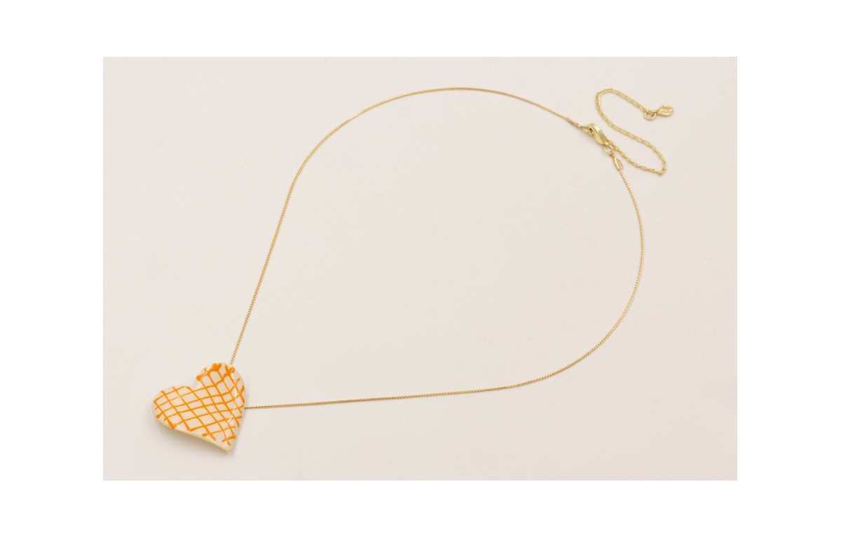 Solitario cadena fina dorada con colgante corazón esmaltado beige cuadros naranjas.
