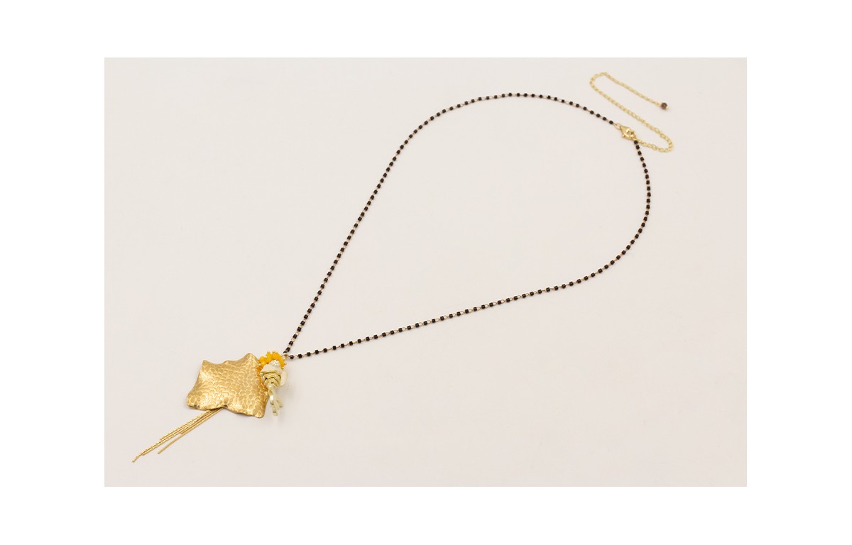 Collar cadena miyuki negro con colgante irregular manta raya, pez articulado esmalte beige, fleco dorado mate y burruño facetadas amarillas.