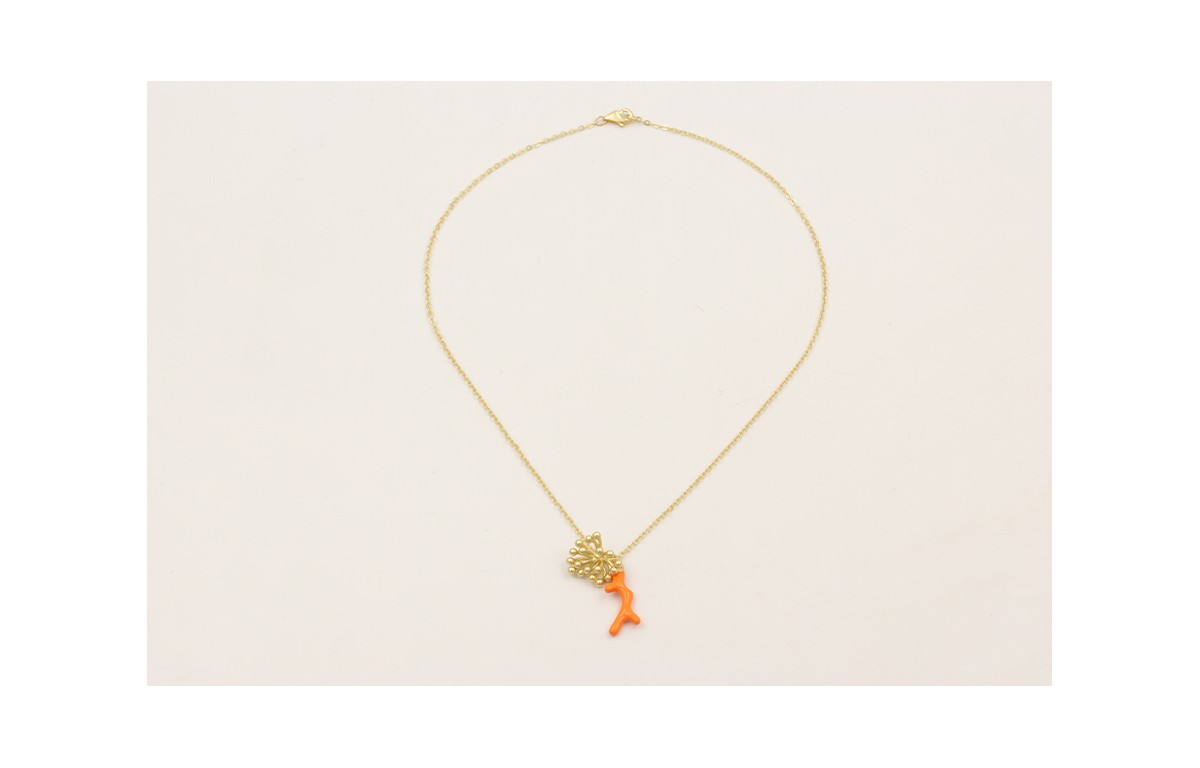 Collar cadena eslabón dorado mate con rama coral esmaltada naranja y colgante ramillete dorado mate.