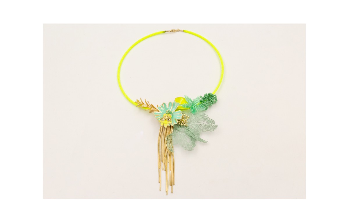 Collar rigido forrado con cordón elastico fluor, centro con rama dorada, flor esmaltada turquesa, pez artuculado fluor, burruño bolitas piedras verdes, petalo fluor, flor miyuki turuqesa, peces.