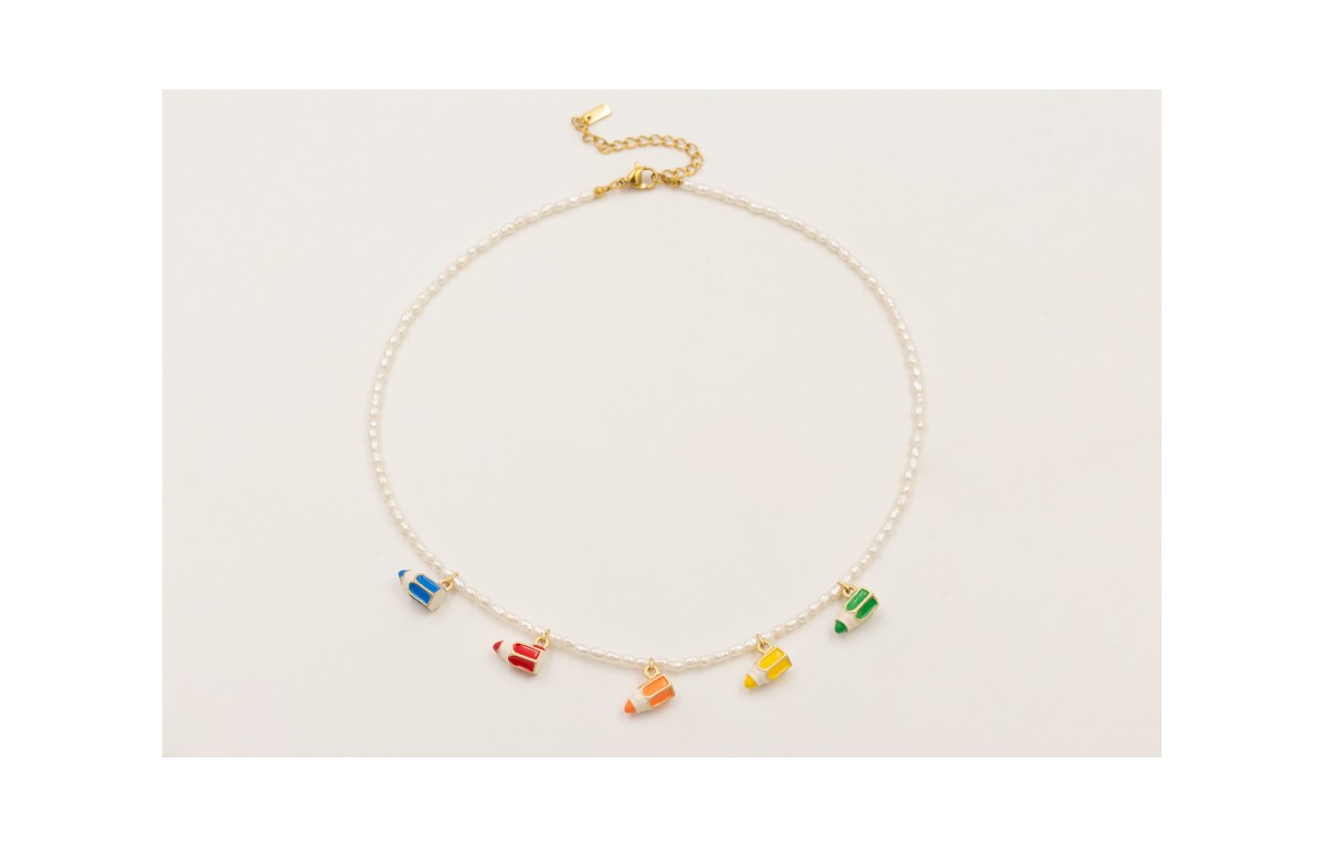 Collar perlas naturales con colgante lapices esmaltados blanco, verde, amarillo, naranja,rojo y azul.