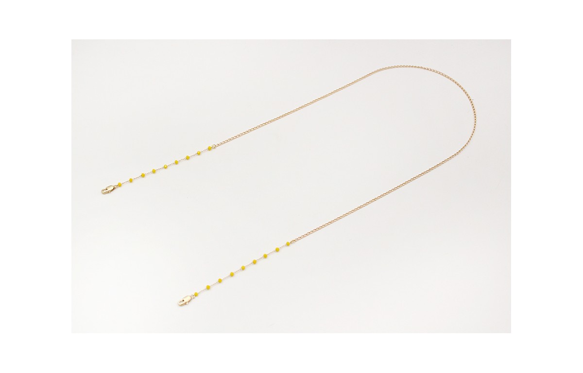 Cuelga mascarilla de cadena bolas facetadas amarillas y cadena de eslabón en oro mate. Largo 62cm.