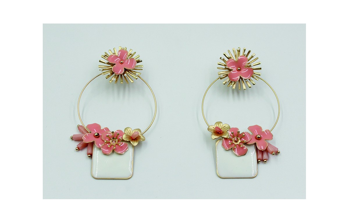 Pendientes aro con flores rosas cosidas y rectangulo esmaltado blanco