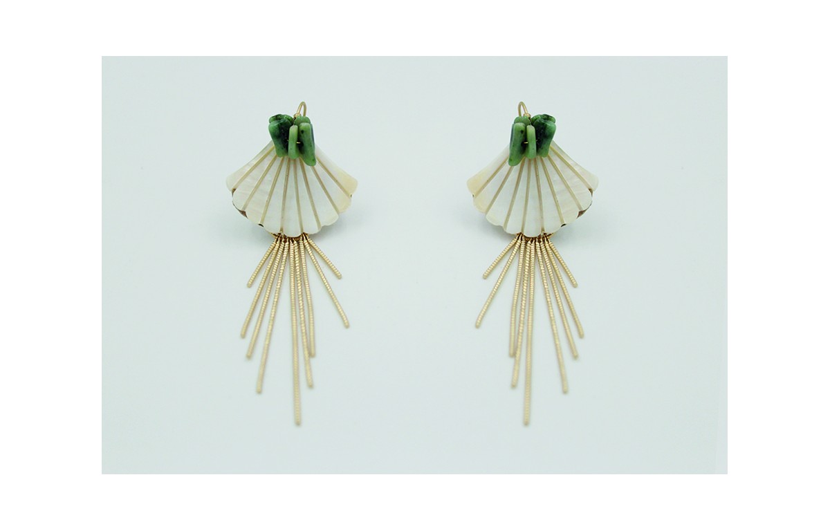 Pendientes concha triangular nacar, corales verdes y aro con colgantes. Largo del pendiente 8cm.