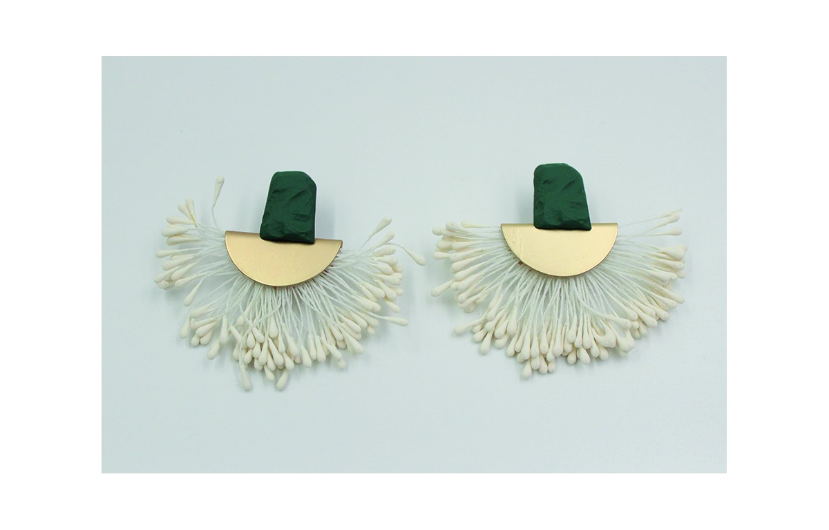 Pendientes perno martilleado verde mate y colgante estambres blanco. Largo pendiente 5cm.