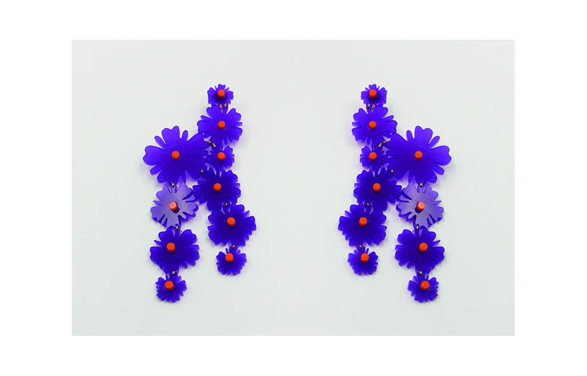 Pendiente grande de varias flores de metacrilato en color morado y puntos naranjas. Largo del pendiente 13cm.