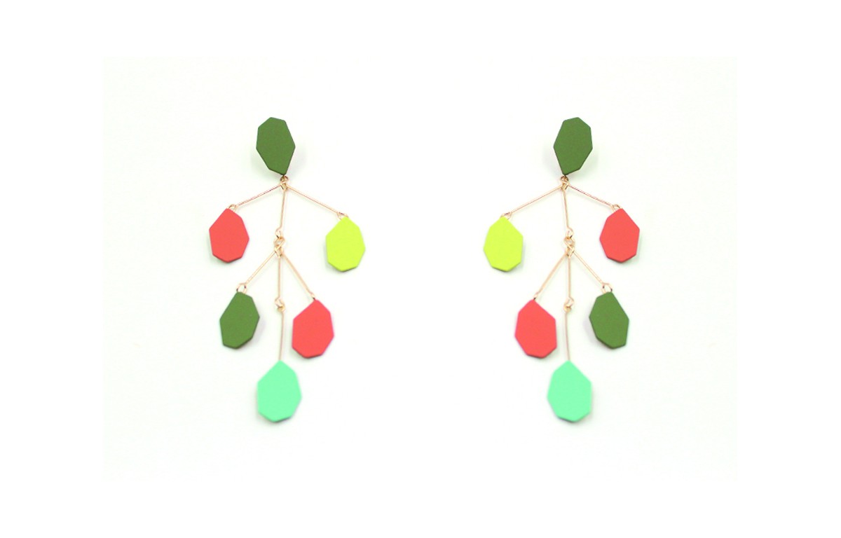 Pendientes en forma de arbol con esmaltes mates en color pistacho, turquesa, coral y verde. Largo del pendiente 11cm.