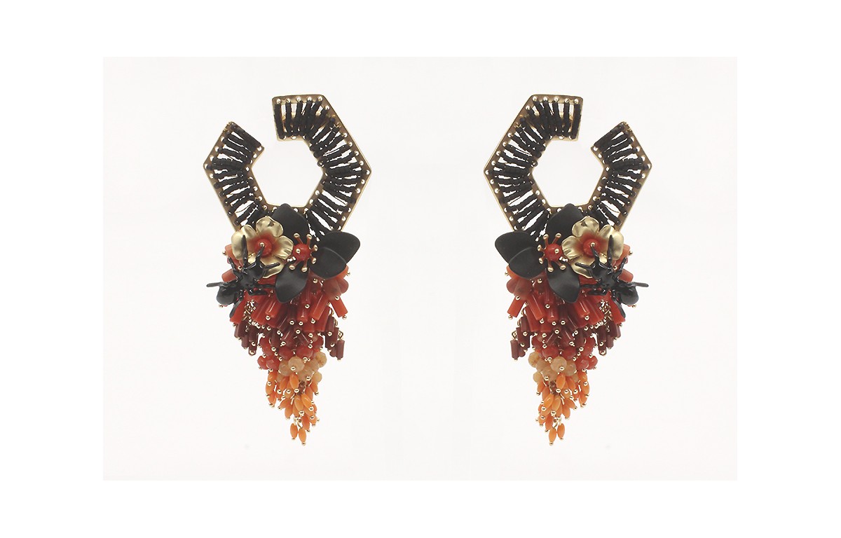 Pendientes de miyuki negro mate con cascada de corales y flores y hormiga negra. Largo 10cm