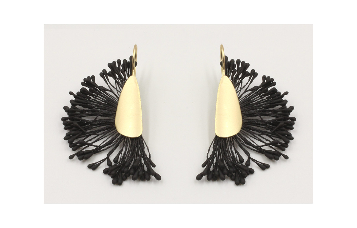 Pendientes de lamina oro mate con estambres en color negro. Largo 7cm