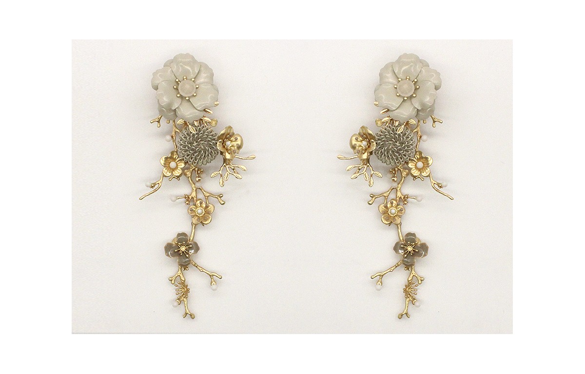Pendientes rama coral oro mate con flor esmaltada gris, bolitas coral blanco. Largo 12cm.