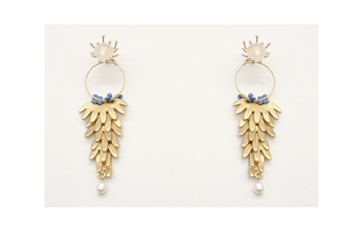 Pendientes perno brillo opal blanco con escamas en oro mate y microesmaltes azul, rematado con una perla natural. Largo10cm