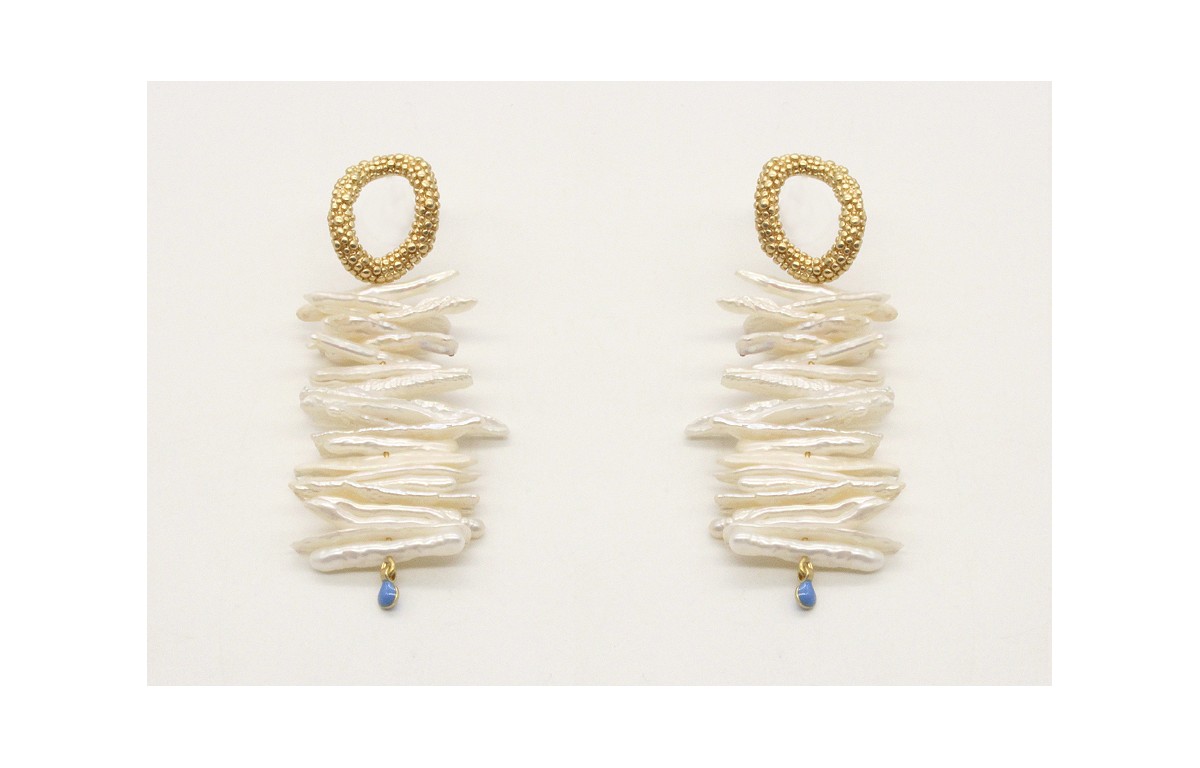 Pendientes con perno aro pata pulpo y listones perla rematados con un microesmalte azul. Largo 6cm.