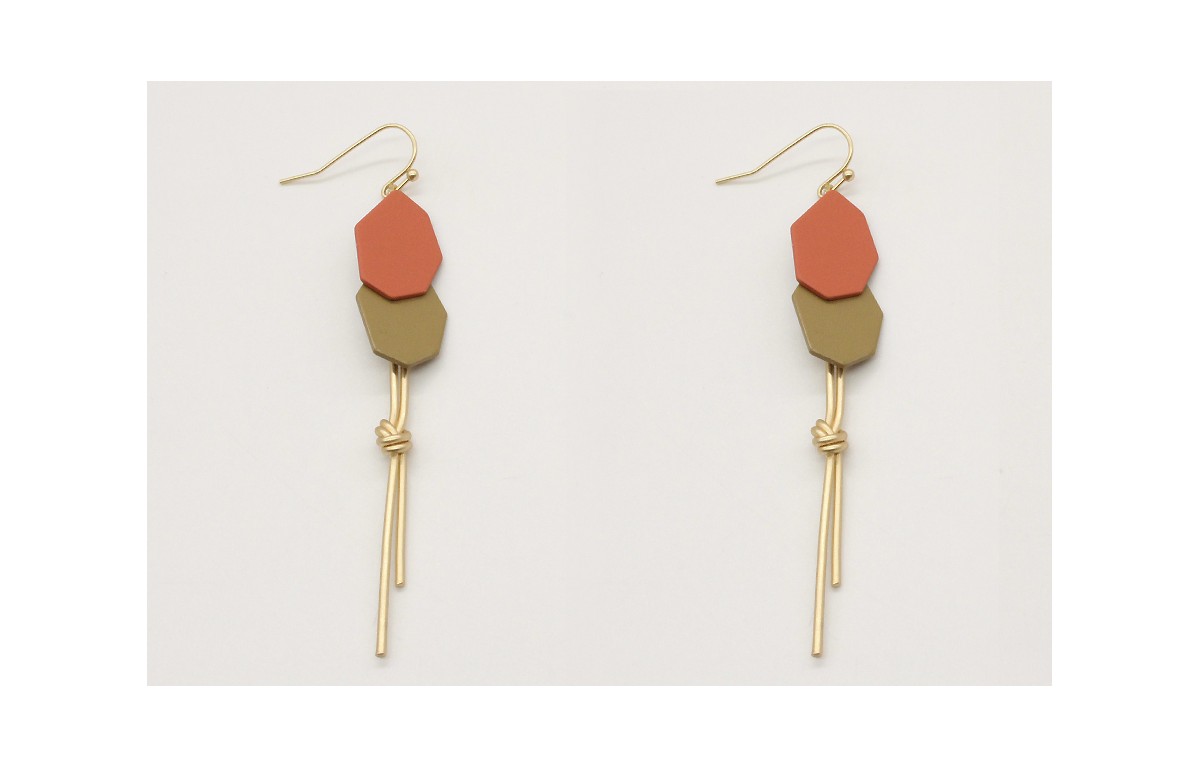 Pendientes con piezas esmaltadas en color coral y en visón rematada con pieza nudo oro mate. Largo 8,5cm